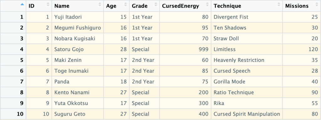 ID Name Age Grade CursedEnergy Technique Missions Ranking