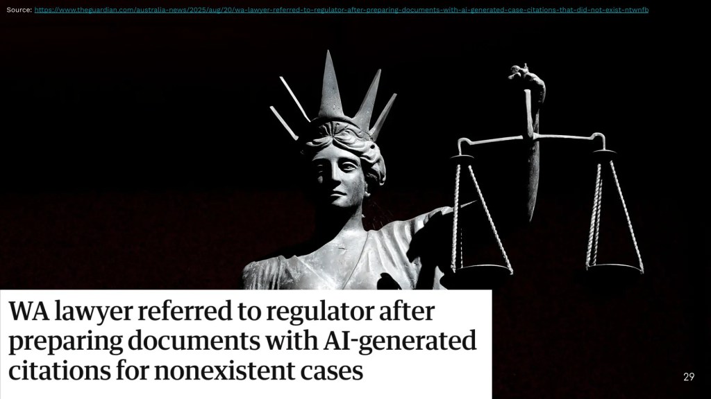 เราควรจะเช็กงานของ AI ทุกครั้ง เพราะถ้าเราไม่รับผิดชอบกับงานของ AI เราอาจจะเป็นเหมือนทนายความจากออสเตรเลียที่ถูกตรวจสอบ หลังจากศาลพบว่าเอกสารที่ทนายนำส่งเป็นข้อมูลที่ไม่มีอยู่จริง