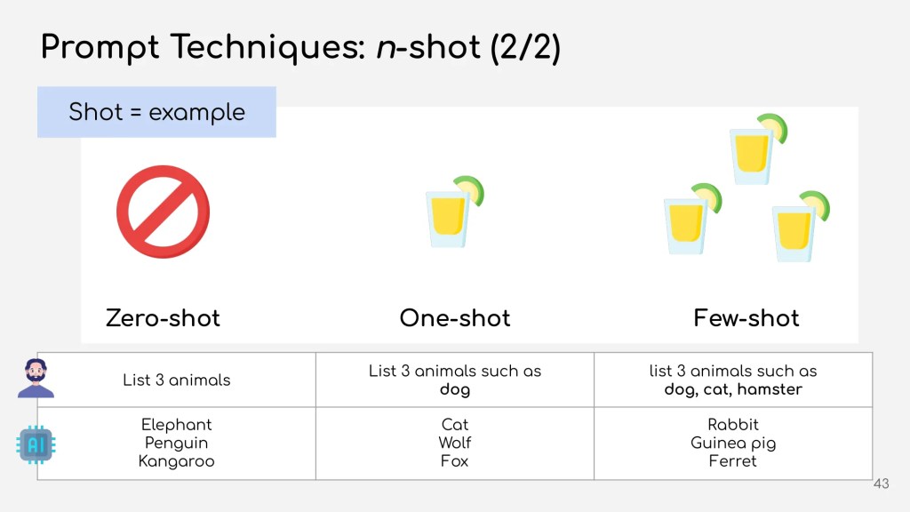 จะสังเกตว่า ยิ่งให้ shot เยอะ คำตอบของ AI ก็จะยิ่งใกล้เคียงกับตัวอย่างมากขึ้น (zero-shot ให้สัตว์ป่า แต่ few-shot ให้สัตว์เลี้ยง)