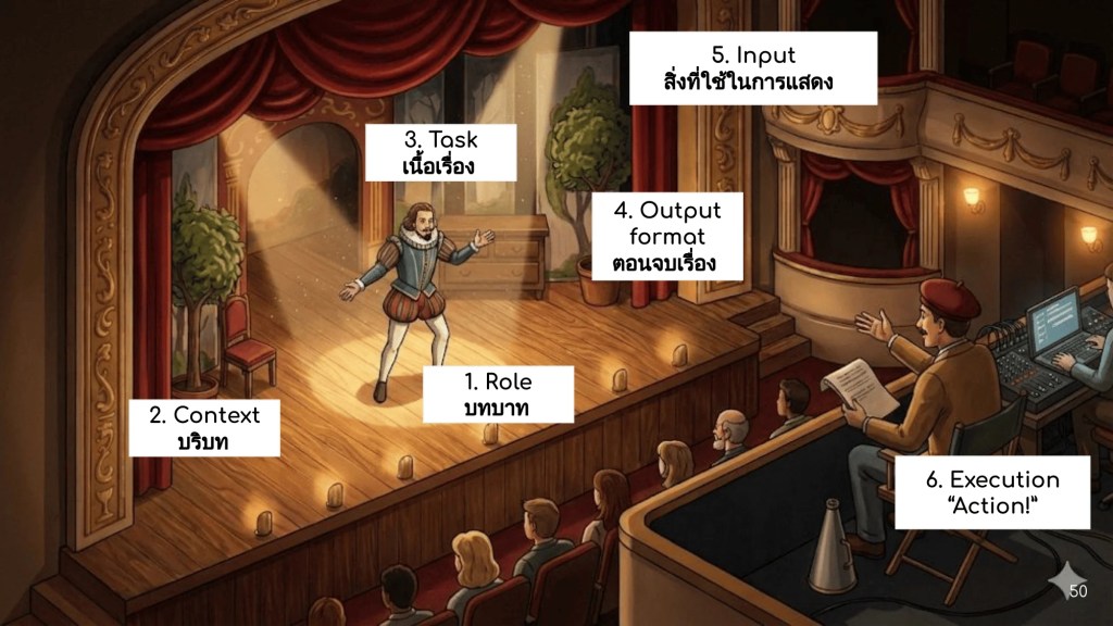 Theatre model เป็นแนวการเขียน prompt ที่มนุษย์เป็นเหมือนผู้กำกับ และ AI เป็นนักแสดงบนเวทีของเรา