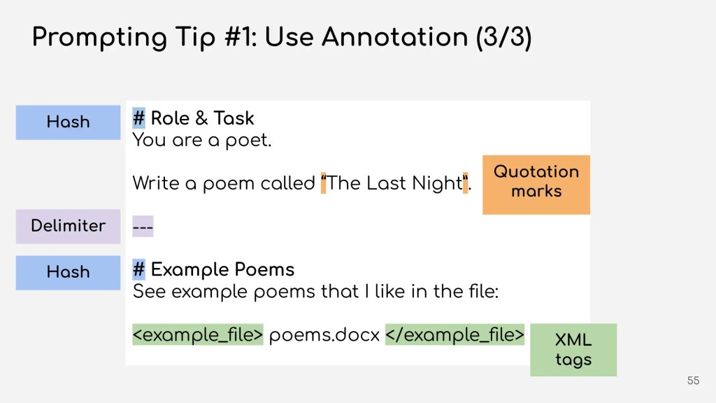 เพื่อช่วยให้ AI เข้าใจ prompt ได้มากขึ้น เราควรจัด format ให้อ่านง่ายโดยใช้ XML tags และ markdown: