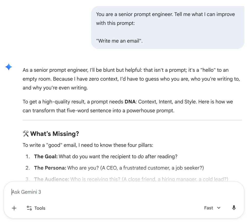ถ้าไม่รู้ว่าจะเขียน prompt ยังไง หรือ prompt ยังขาดอะไรไป เราสามารถถาม AI ได้ให้ช่วยเราได้