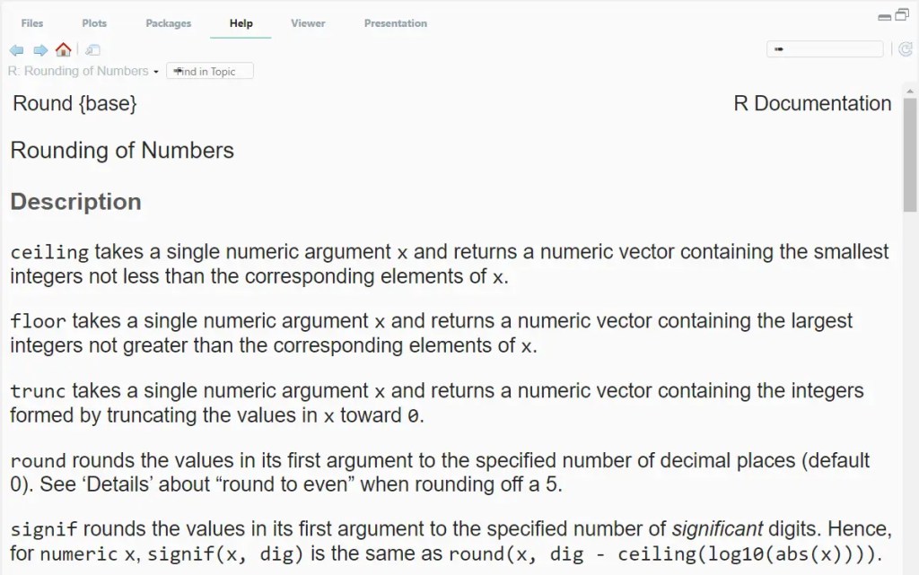 เราจะเห็นคู่มือการใช้งาน round() ในหน้าต่างของเรา: