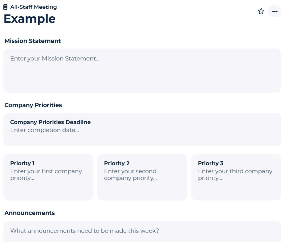 1. All-Staff Meeting: ประชุมรวมพนักงาน ทุก ๆ วันแรกของสัปดาห์ เพื่อช่วยให้พนักงานโฟกัสกับ 3 economic priorities และรักษากำลังใจพนักงาน ใช้เวลา 45-60 นาที