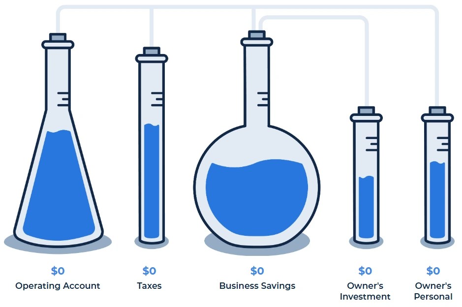 การไหลของเงินใน Cash Flow Made Simple: Operating Account >> Personal Account (Owner’s Personal) + Tax (Taxes) + Business Profit Account (Business Savings) >> Investment Holding Account (Owner’s Investment)